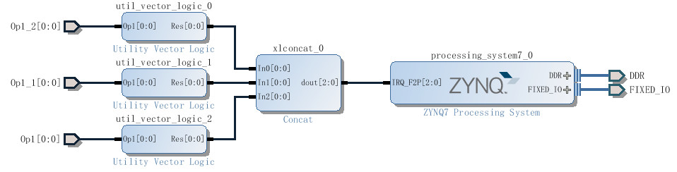 其中Concat模块只是简单的将多个信号合并为一个总线连接到zynq;而Utility Vector Logic则是执行一些逻辑计算,这里选择not逻辑计算。