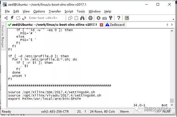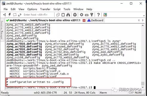 在编译u-boot之前,需要先将配置选项写入.config配置文件中,输入命令make ARCH=arm CROSS_COMPILE=arm-linux-gnueabihf- zynq_zed_defconfig进行配置。注意,你需要先source /opt/Xilinx/SDK/2017/setting64.sh添加相关引用才能使用,当然也可以把上述命令写入/etc/profile这样就可以开机使用。