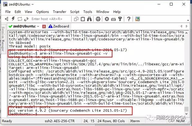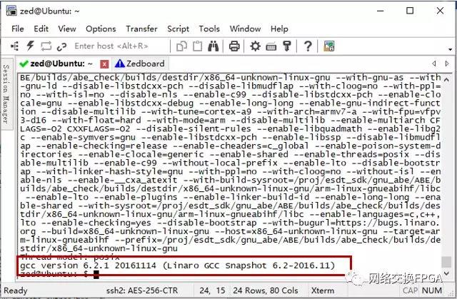 添加引用1后即可使用交叉编译链。Xilinx在较早的VIVADO SDK版本中提供了arm-xilinx-linux-gnueabi-编译链,区别在于arm-linux-gnueabihf-使用硬件加速浮点数运算,而arm-xilinx-linux-gnueabi-使用软件计算。通过查询资料,发现17.4版本的SDK中包含arm-xilinx-linux-gnueabi-编译链的引用,但是软件安装时没有成功安装,这应该是17.4版本的一个BUG,我们在另一台安装15.4版本VIVADO SDK的Ubuntu主机下,找到/opt/Xilinx/SDK/2015/gnu/arm文件夹,将其拷贝到17.4版本对应的目录,发现可以成功引用,输入(交叉编译链)gcc-v查看: