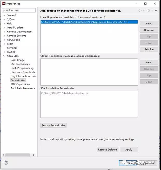 通过VIVADO SDK可以生成设备树描述文件,这样便于我们开发,而不需要完全手动创建。VIVIADO安装时并没有安装设备树生成器,所以需要我们手动安装。我们首先下载xilinx提供的device tree generator,并安装到SDK。访问https://github.com/Xilinx/device-tree-xlnx/releases获取对应版本的设备树生成器。下载并放到VIVADO安装目录下的SDK/2017.4/data/embeddedsw/devicetree/bsp/目录下,重命名为device-tree-xlnx_v2017_4(我的VIVADO版本为17.4)。打开SDK,在SDK中操作点击菜单: Xilinx Tools -> Repositories,然后在LocalRepositories中添加我们刚才下载的SDK/2017.4/data/embeddedsw/devicetree/bsp/device-tree-xlnx_v2017_4路径并点击OK。