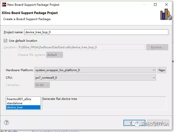 添加成功后如上图。点击菜单File -> New -> Board Support Package。弹出选项卡New Board Support Packet Project,选择device_tree,如果你上一步配置不成功,则不会出现device_tree选项,此时需要检查上一个步骤的问题。添加成功后点击Finish选项,VIVADO SDK会自动生成设备树描述文件dts。