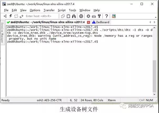 在SDK目录下的device_tree目录下可以看到很多dts文件,system-top.dts就是我们需要编译的设备树描述文件。它引用了zynq-7000.dtsi等对于zynq芯片通用的部分文件。将SDK目录下的整个device_tree目录上传到Ubuntu服务器,使用dtc编译器编译。编译命令如下: