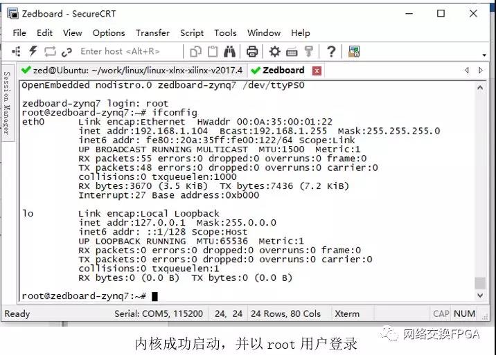 1> 挂载Ubuntu的NFS服务,(需要Ubuntu开启NFS服务并指定路径)首先查询Ubuntu IP地址为192.168.1.103,在Zedboard控制台输入: