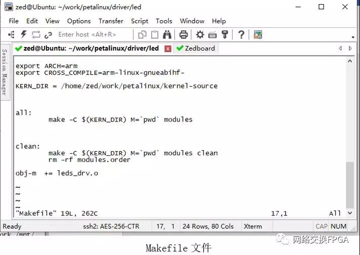 Linux驱动程序有静态编译进内核和动态模块加载两种,这里选择动态模块加载的方式,便于进行调试。在前面的硬件设计中,我们将AXI-Lite Slave的四个寄存器挂载到基地址为0x43c00000的位置,而Zedboard板卡上的8位LED灯连接到了寄存器0的低8位,因此我们写寄存器0的低八位就能很容易的通过LED的状态来判断写入是否成功。