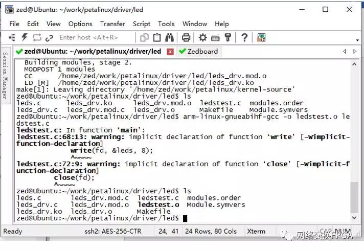 Make命令执行成功,目录下生成最终使用的ko文件部分中间文件。使用 arm-linux-gnueabihf-gcc -o ledstest.o ledstest.c 生成测试程序。