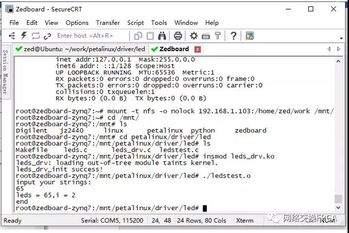 回到串口工具连接Zedboard板卡,使用insmod挂载驱动,并执行测试程序。