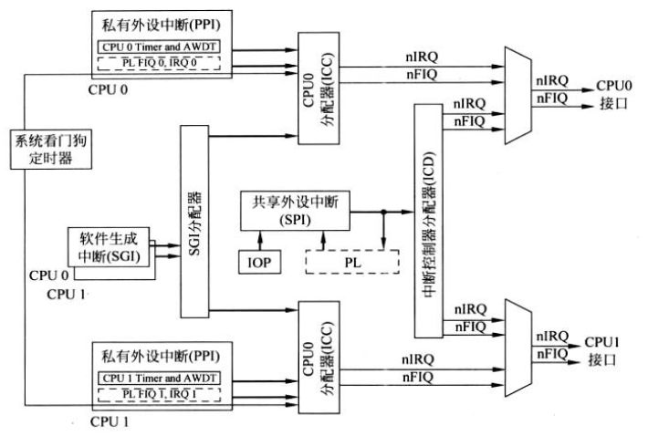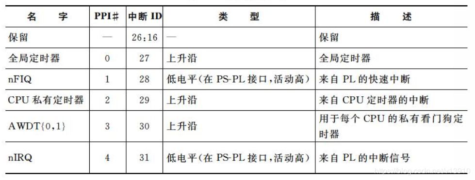 1)私有中断:每个CPU连接5个私有中断,中断ID27—31。