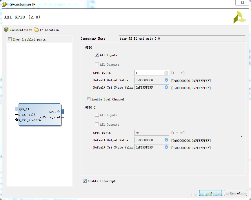 ① 加AXI_GPIO IP核,设置GPIO端口中断使能,GPIO宽度为1(只用了一个按键),设置方向为全输入。