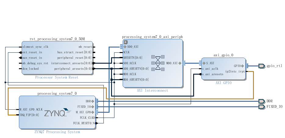 然后,因为要用到PL端的按键,所以要建立PL与PS之间的联系,通过EMIO或者AXI总线,EMIO能不能中断还没有研究,这里用的AXI。