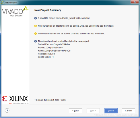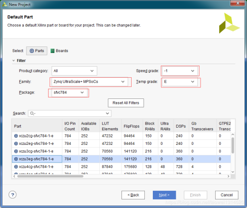 按照截图的配置选择开发板型号为 xczu3eg-sfvc784-1-e ,点击Next