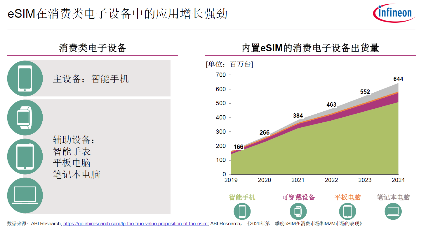 ABI Research的报告也显示未来将会有更多的消费类电子产品采用eSIM方案。该机构预测,到2024年,内置eSIM的消费类电子产品出货量,会超过6亿台,达到6.44亿的量,其中约5亿台智能手机将安装eSIM。 也就是说基本上所有的高端看手机都会有这个功能。