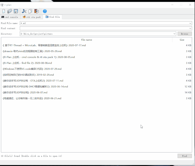 今天这篇是介绍一个新开发的功能-《find file》。在Linux开发,我们会用到grep和find命令查找文件和文件中字符串,但是windows开发没有对应的命令行让我们快速的查找,虽然网上有一些软件提供给我们下载应用。但是你又要安装一个软件,多麻烦。为了解决这个问题,所以R-Plan就集成了这个功能。