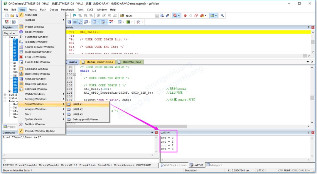 下面提供的工程,直接编译,再点击调试按钮,打开UART 1#,全速运行,就能看到printf打印效果: