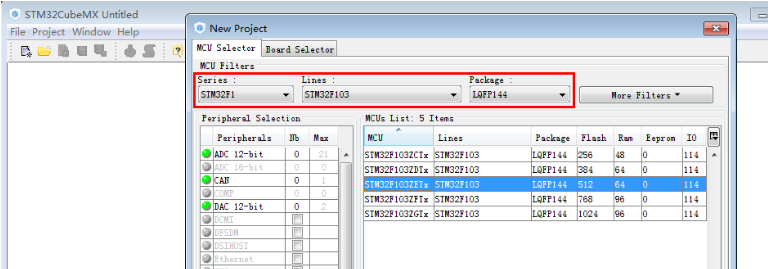 打开STM32cubeMX软件,点击New Project。选择对应开板MCU(STM32F103ZET6)。