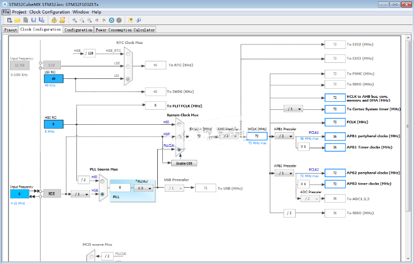 时钟配置采用图形配置,直观简单。各个外设时钟一目了然。STM32最高时钟为72M,此处只有在HCLK处输入72,软件即可自动配置。(RCC选择外部高速时钟)。