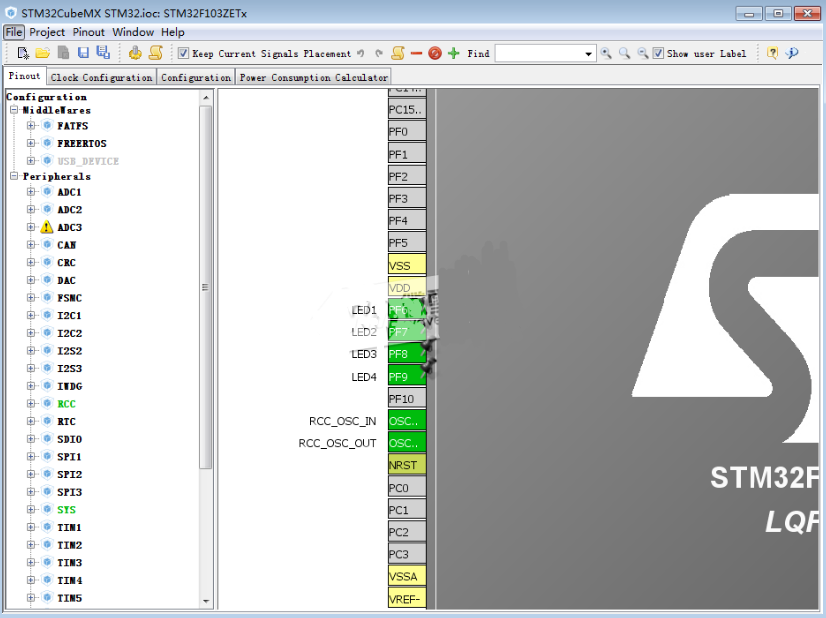 GPIO口功能选择,PF6,PF7,PF8,PF9为LED1-LED4.找到对应管脚设置为GPIO_Output模式。(黄色引脚为该功能的GPIO已被用作其他功能,可以忽略。绿色表示管脚已使用)