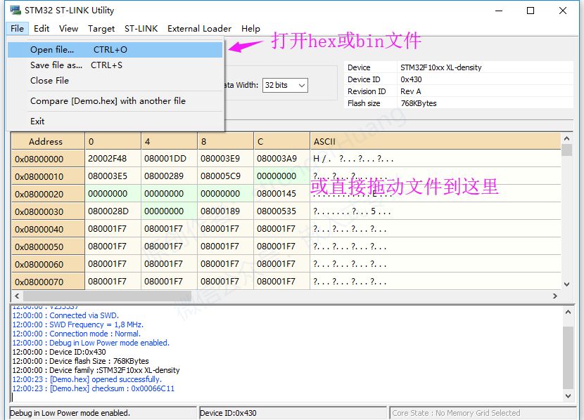STM32 ST-LINK Utility的功能比STM32CubeProg要稍微简单一些,其主要功能也是编程(下载)。 打开需要下载的可执行文件(hex或bin),或者直接将文件拖到其中,如下图: