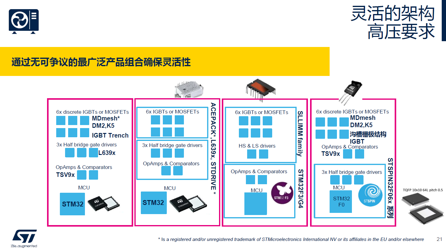 在电机主控方面,ST的MCU可以支持从步进电机、直流电机到BLDC的各种电机。“在数字控制和模拟控制方面,我们有系统级封装和嵌入式智能方案,功率密度高达500W /cm2。专门的电隔离驱动技术保护人身安全。从非常低的功率到非常高的功率,从数字控制器到模拟控制器,从内部嵌入式开关MOSFET,到使用IPM的扩展MOSFET,我们皆可提供丰富的产品组合以及拥有两种出色的技术:STSPIN和STDRIVE。”沐杰励对<电子发烧友网>表示。