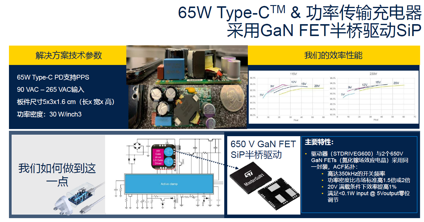 目前市面上的GaN充电器可支持USB快充,以27W、30W和45W功率居多。在本次见面会上,沐杰励介绍了采用一款采用GaN FET SiP 半桥驱动的65W Type-C & PD充电器。该方案的驱动器与2个650V GaN FET采用同一封装,开关频率达到350kHz,功率密度比市场标准高1.5倍至2倍。