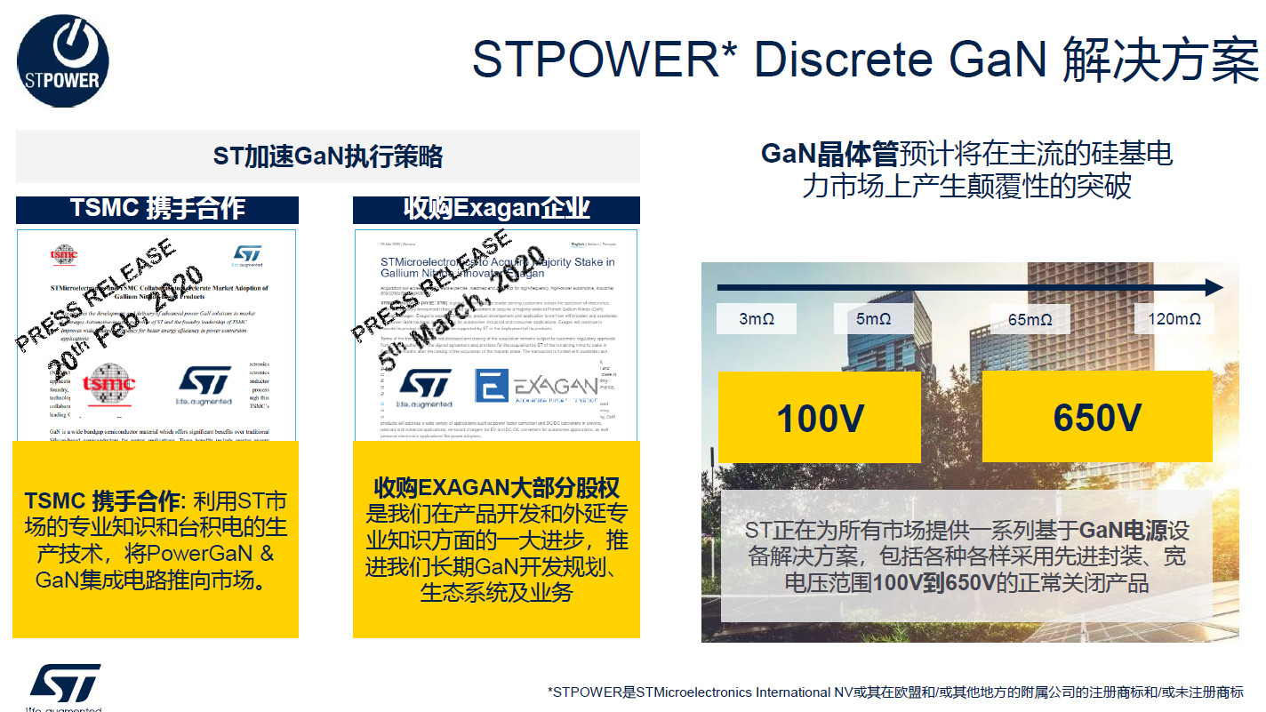 今年2月,意法半导体宣布与台积电在GaN方面加强合作。意法半导体将采用台积公司的氮化镓工艺技术来生产GaN产品。3月份又收购了Exagan的大部分股权,推进ST长期GaN开发规划、生态系统和业务。这一系列的动作足以看到ST对GaN开发的重视。