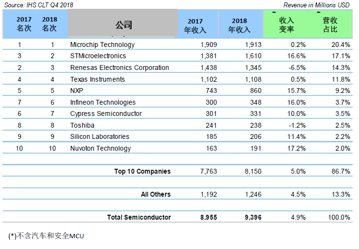 图2:2018年通用MCU厂商排名。(来源:ST)