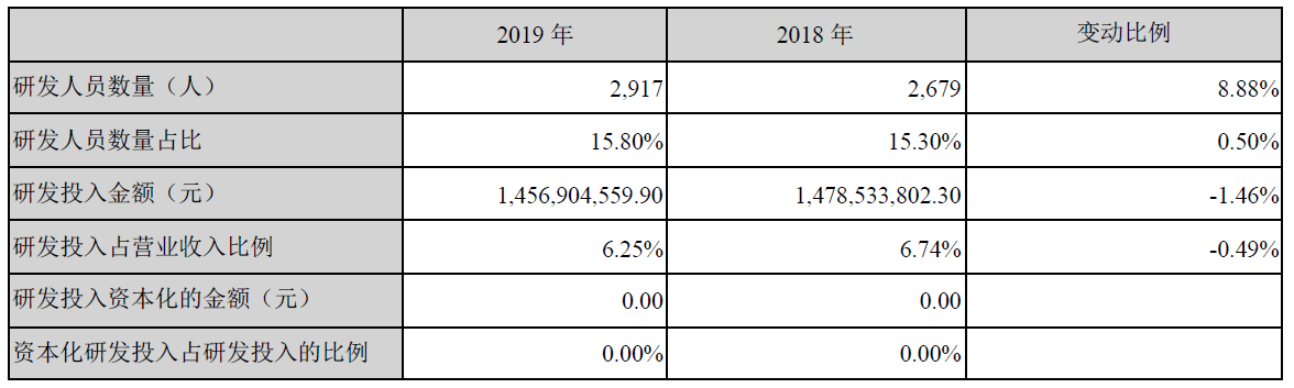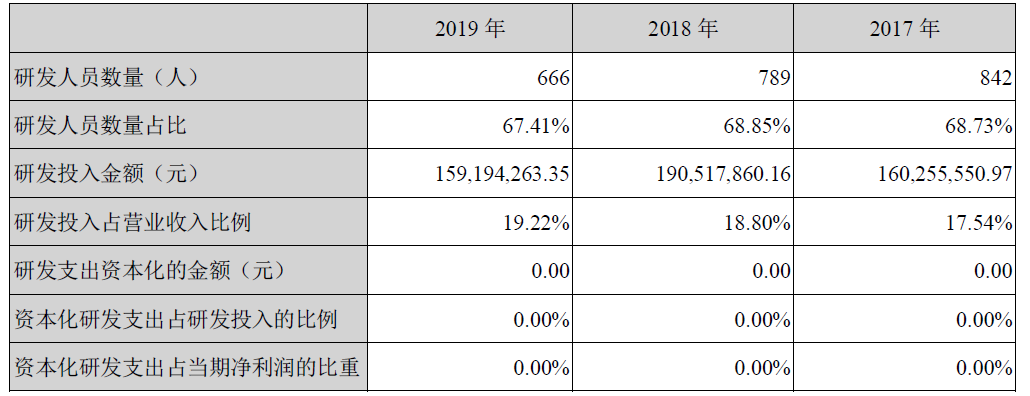 在研发投入方面,2019年东软载波的研发投入金额为1.6亿元,同比下降16.44%,占当期营业收入的19.22%,同比增长0.42%。