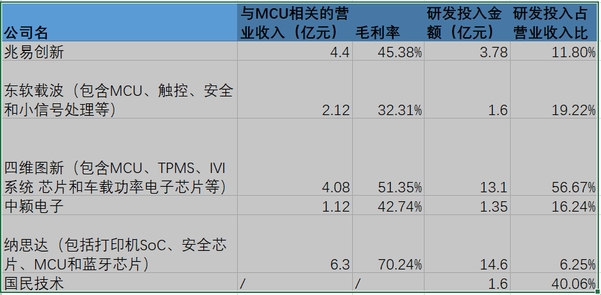 虽然国内企业在MCU市场的占比不高,但参与的企业是相当多的。单就A股市场就有兆易创新、中颖电子、东软载波、纳思达、四维图新、国民技术等厂商。我们从他们发布的2019年年报中,看看与MCU相关部分的营收、毛利、以及研发投入情况。