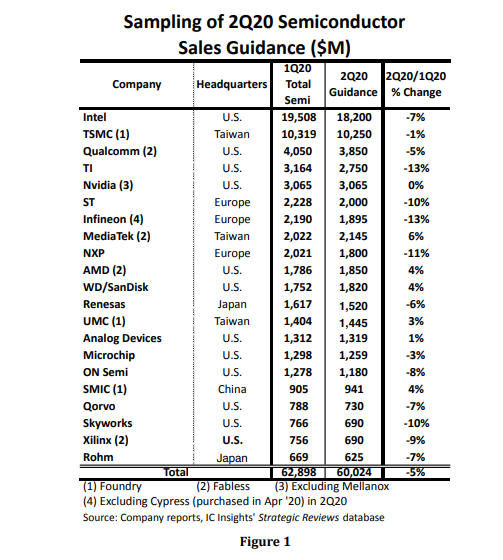 IC Insights 公布了2020年二季度的销售预期,6家公司预计第二季度销售额将增长,而15家公司预计将持平或下降,作为McClean报告5月更新的一部分,IC Insights 完成了一份半导体公司清单,其中提供了2020年二季度销售预期,此清单的公司来自全球各个国家和各地区,包含所有半导体种类。