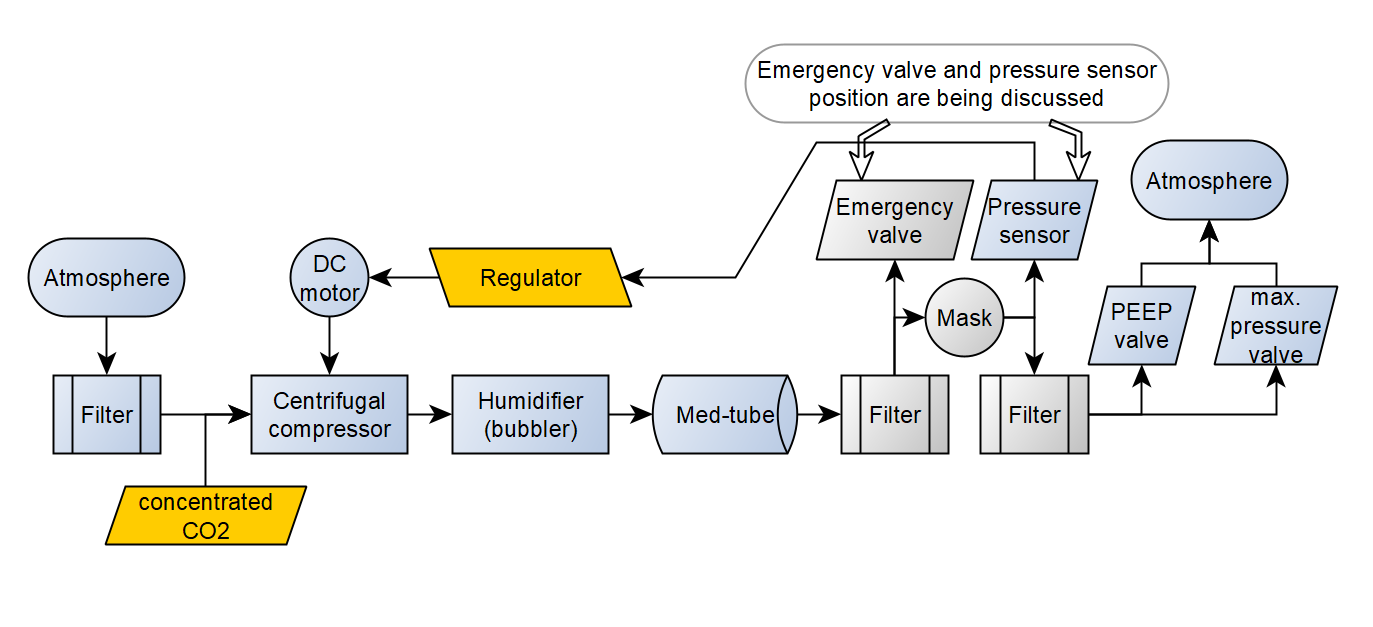 VentilAid是一个自发组织的工程师和设计师群体,他们开发的VentilAid自制呼吸机也是以复苏气囊为核心。将空气滤除浓郁的二氧化碳后,经由直流电机驱动的离心压缩机,再通过加湿器和医用输气管,二次过滤后再传入氧气面罩。