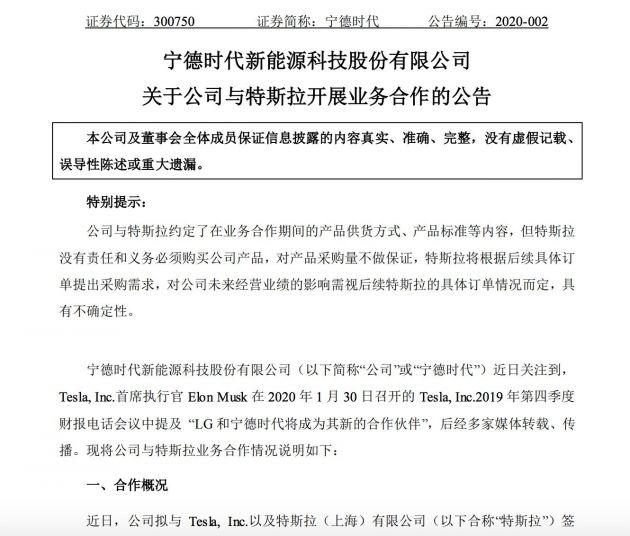 上个月底,特斯拉发布了2019年Q4及全年财报,在当时财报会议上,马斯克明确表示将引入LG化学和宁的时代作为其动力电池供应商。