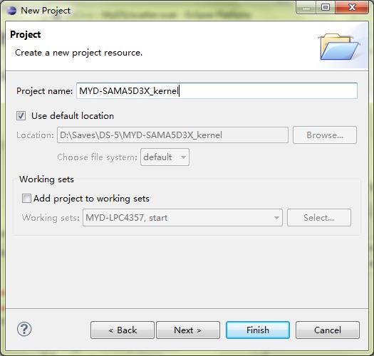 (18)在project name中输入工程名称,这里名为“MYD-SAMA5D3X_kernel”,然后点击“finish”完成工程创建。