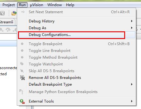 (20)选择DS-5菜单栏“run”>“debug configuration…”,配置调试选项进行。