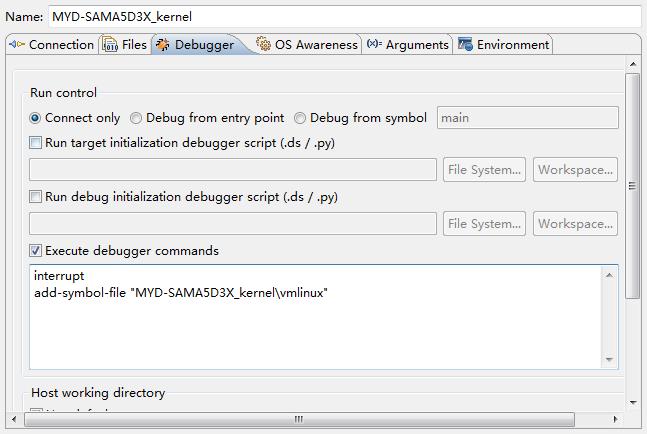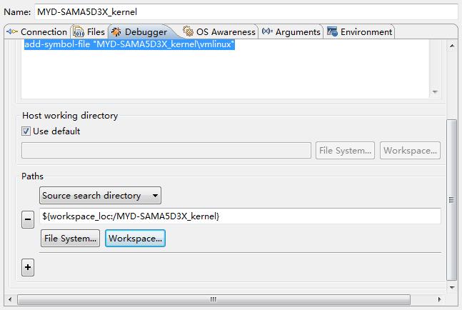 (22)下拉“debugger”选项卡,点击“paths”下面的“workspace…”按钮,选择“MYD-SAMA5D3X_kernel”工程作为DS-5源码搜索路径。