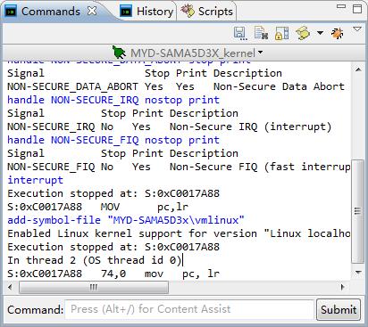 (19)命令栏,可以在“commands”后面敲入命令,让开发板执行,比如敲入“step”就会进行单步调试。鼠标位于输入框内,按“Alt + /”可获得命令提示。