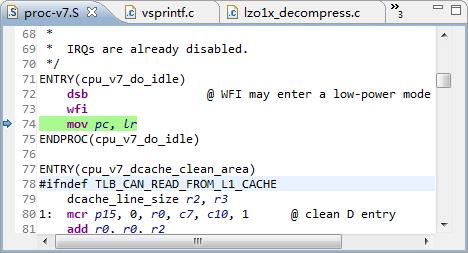 (17)打开开发板电源(或者复位),让开发板u-boot引导kernel,然后点击DS-5中的的“debug”按钮开始调试。