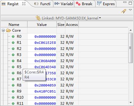 (21)寄存器栏,显示内核里面的所有寄存器,在调试的时候可以对寄存器进行修改。