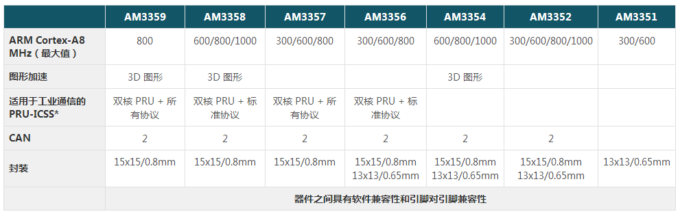 1.处理器采用系列化,从高端过渡到低端,满足不同行业客户的各种功能需求,达到性价比最优的微妙平衡。分别有AM3359/AM3358/AM3357/AM3356/AM3354等多款配置参数各不相同的处理 器,且系列处理器管脚PIN对PIN兼容,方便客户进行产品升级