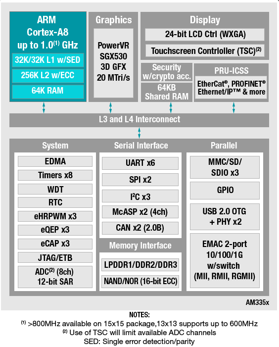 1. AM335X是275-MHz, 500-MHz, 600-MHz, or 720-MHz ARM Cortex-A8,32位RISC微控制器NEON SIMD协处理器具有单错检测(奇偶校验)的32KB/32KB L1指令/数据高速缓存具有错误 纠正码(ECC)的 256KB L2高速缓存
