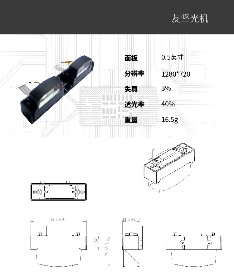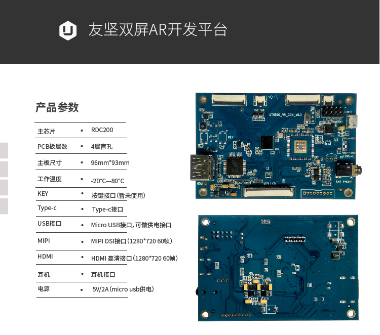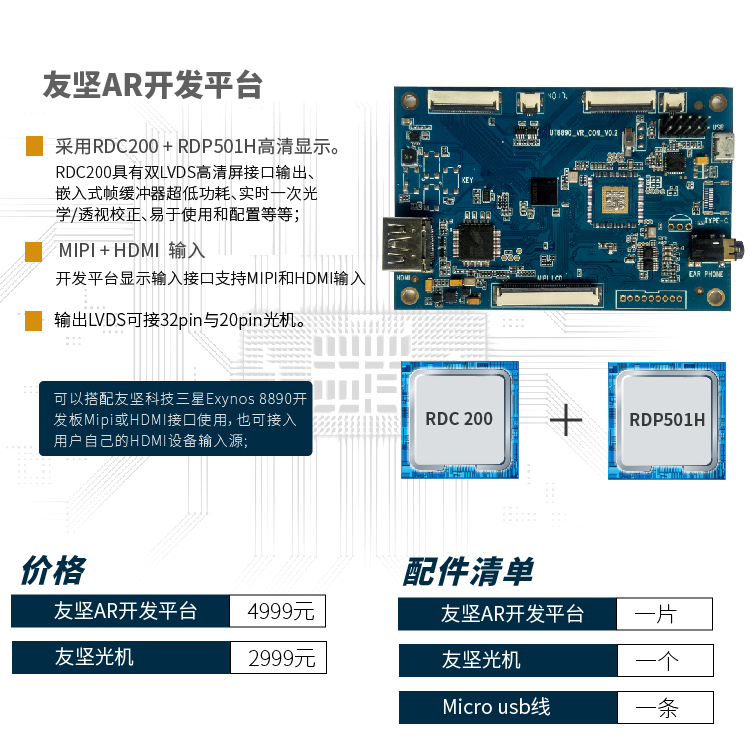 友坚科技AR双屏开发发台采用韩国RDC200芯片具有双LVDS高清屏接口输出、嵌入式帧缓冲器超低功耗、实时一次光学/透视校正、易于使用和配置,采用RDC200 + RDP501H高清显示,开发平台显示输入接口支持MIPI和HDMI输入,可以搭配友坚科技三星Exynos 8890开发板Mipi或HDMI接口使用,也可接入用户自己的HDMI设备输入源;输出LVDS可接35pin与20pin光机。