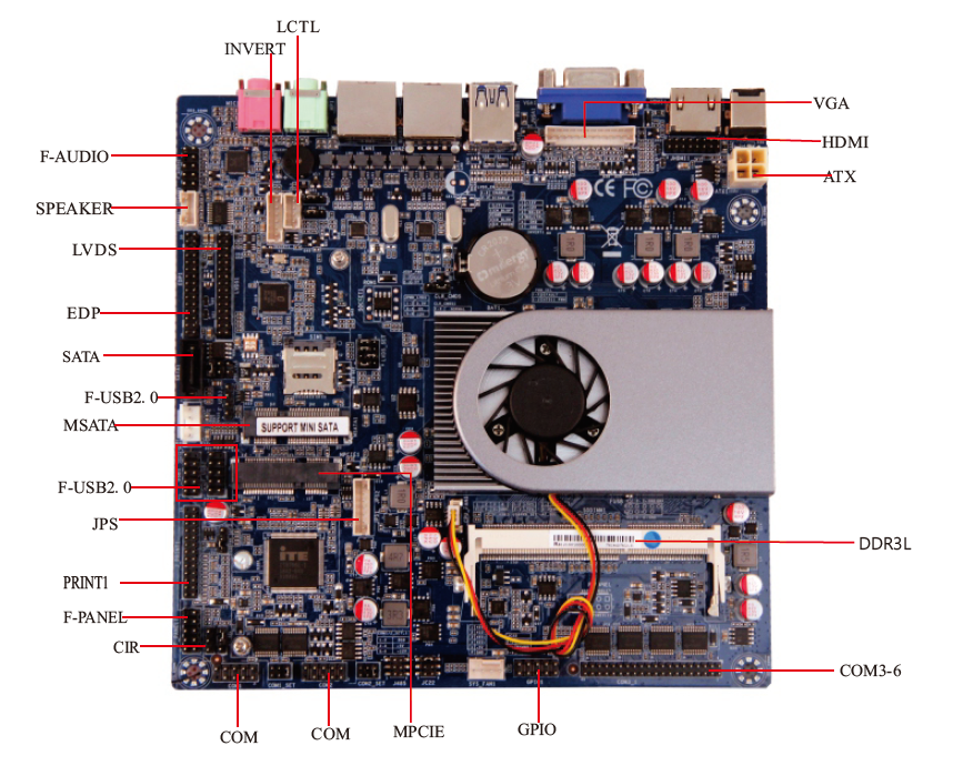 5. 内建1*MPCIE扩展槽,支持Wifi +Bluetooth/4G; 1*SIM 内建1*MSATA3. 0,1*SATA3,0支持2*USB3.0 5/7*USB 2.0