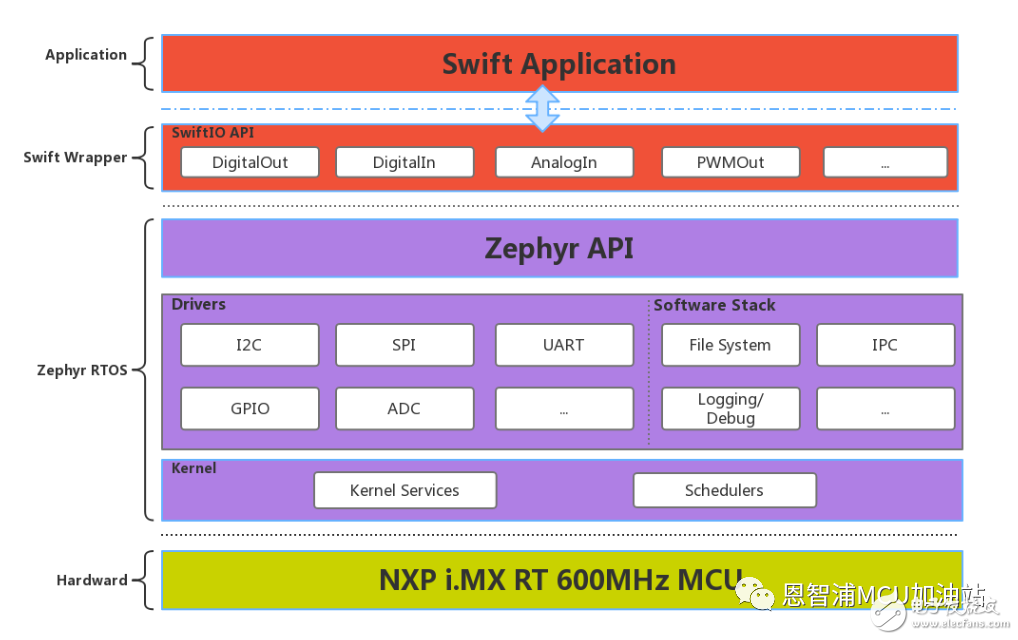 Swift可以与C无缝衔接,我们所做的仅仅是将Zephyr驱动,API用C语言打包封装,然后套上一层Swift的外壳,仅仅是简单的调用关系,没有任何复杂的戏法。