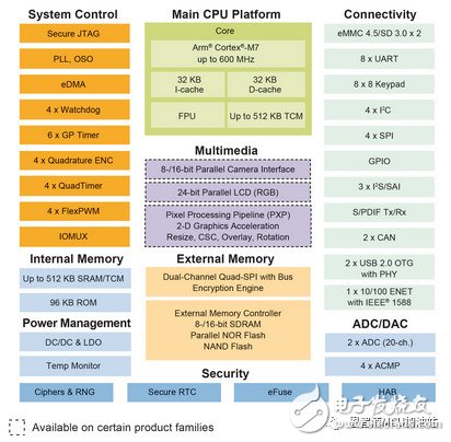 我们的项目是一个更关注应用层开发的创意实现平台,开发者当然不能受到硬件性能的局限。因此我们选择了全球性能最强,性价比也极高的NXP i.MX RT系列MCU作为第一款开发板芯片,其核心参数如下图: