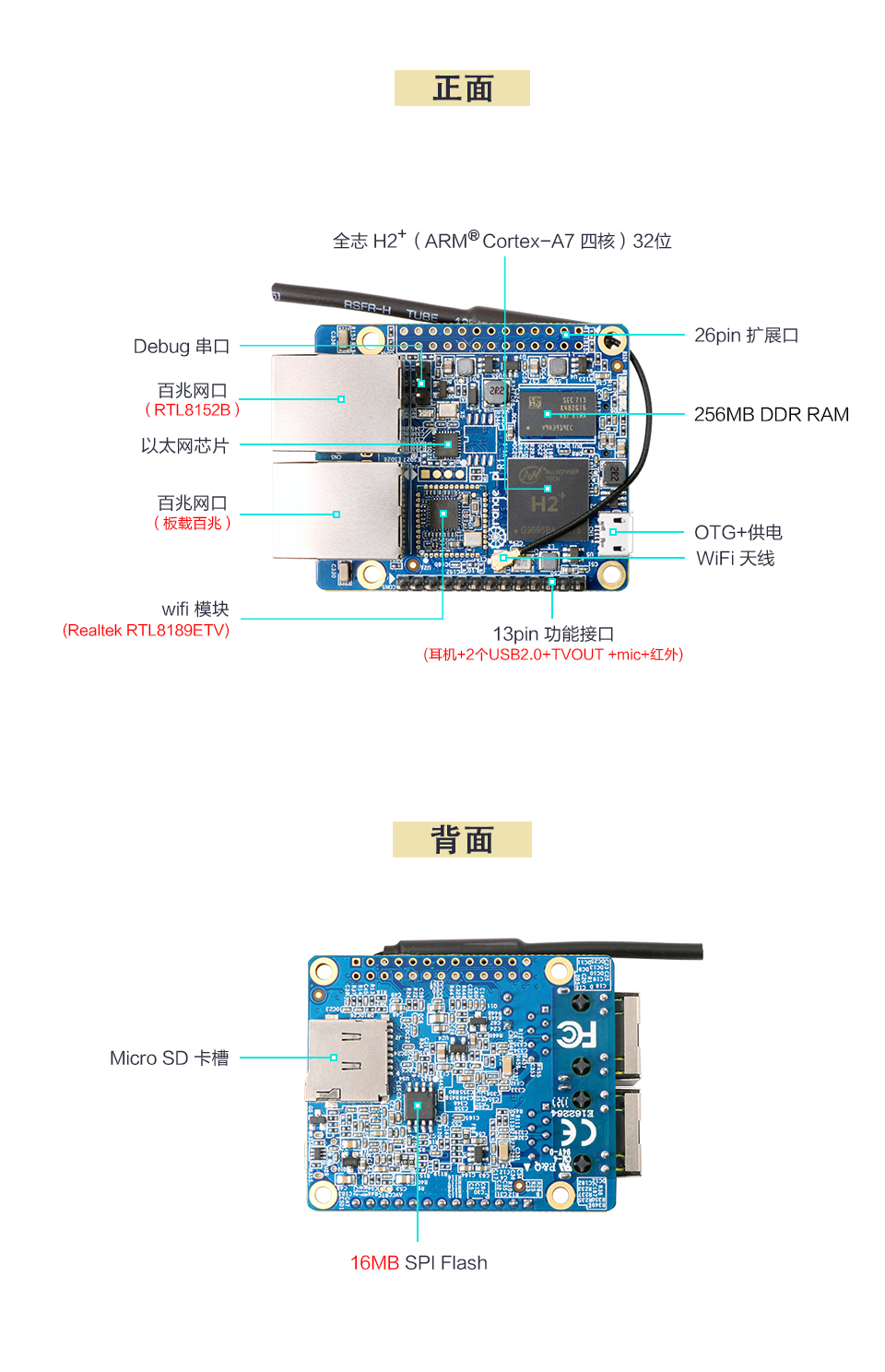 全志H2芯片,4核32位Cortex-A7 |