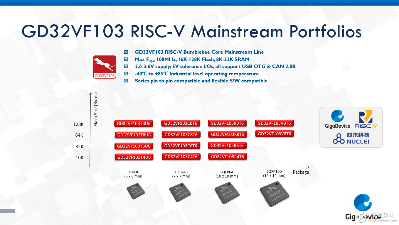 作为GD32 MCU家族基于RISC-V内核的首个产品系列,全新的GD32VF103系列RISC-V MCU面向主流型开发需求,以均衡的处理效能和系统资源为RISC-V进入市场主流应用提供了高性价比的创新之选。新品首批提供了14个型号,包括QFN36、LQFP48、LQFP64和LQFP100等4种封装类型选择,并完整保持了与现有产品在软件开发和引脚封装方面的兼容性。这种前所未有的创新性设计在GD32的Arm®内核产品与RISC-V内核产品之间搭建起快速通道,将跨越处理器内核的产品选型和设计切换变得灵活自如,从而更易于实现代码移植并缩短开发周期。全面适用于工业控制、消费电子、新兴IOT、边缘计算、人工智能及垂直行业的深嵌入式市场应用。