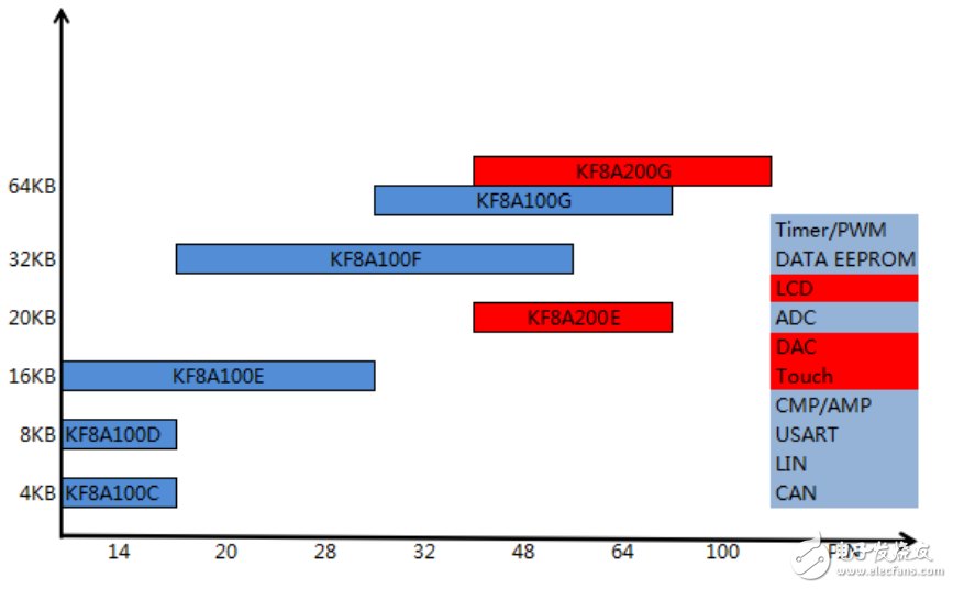 KF8A100和KF8A200共计17款车规级MCU,Flash从4KB-64KB,管脚从14PIN-100PIN,采用模数混合设计思维,提供更为丰富的外设资源,包括支持100万次擦写寿命的DATA EEPROM,12bit ADC,12bit DAC,16位PWM,16位ECCP模块,TouchKey触摸按键,步进电机控制单元,LCD显示驱动,模拟比较器CMP,运算放大器AMP;通信接口方面除了传统的USART,针对汽车电子应用提供了LIN和CAN总线通信接口。