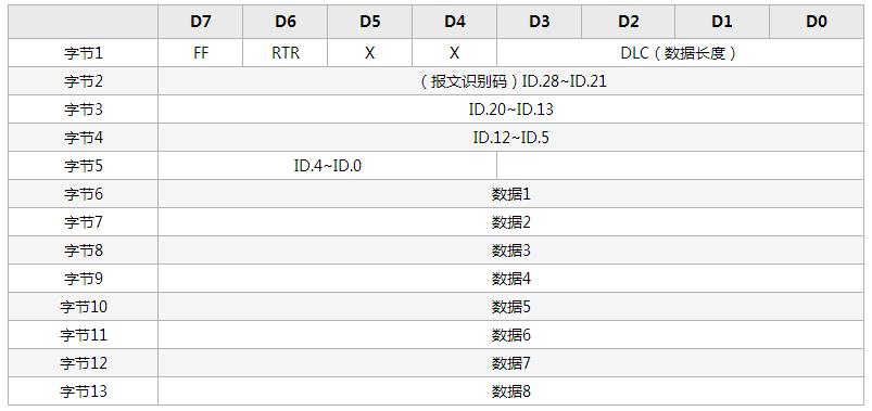 3、字节6~字节13为数据帧的实际数据,远程帧时无效。