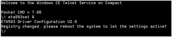 对CE平台,在启动系统后,telnet登录到CE的命令窗口,若要启动ETA508,则带参数执行eta503set.exe,其中若启动第一块ETA508,参数为8: