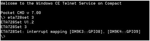 对CE平台,在启动系统后,telnet登录到CE的命令窗口,若要启动ETA728,则带参数执行eta728set.exe,其中参数为3: