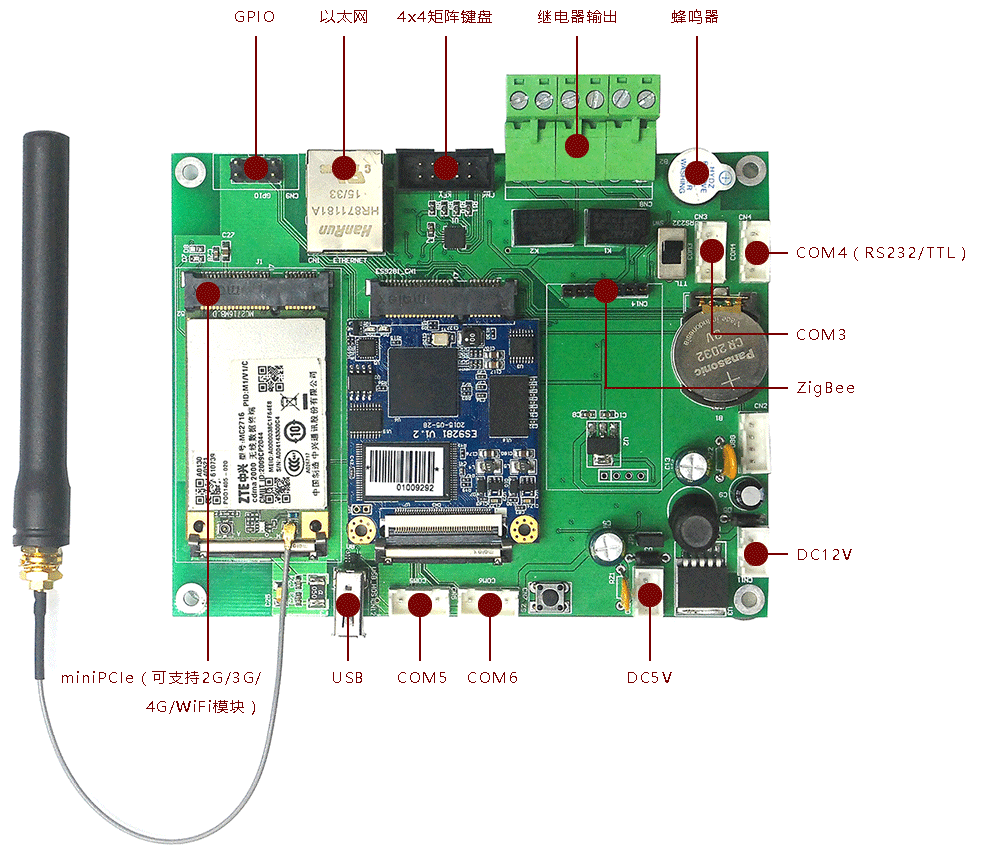 miniPCIe:提供一路miniPCIe接口,可以支持常见的2G,3G、4G以及wifi模块通讯功能。