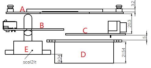 由MLM2014控制板(B),协议转换板(C),LCD板(A),传感器(E),电池腔体(D)组成。